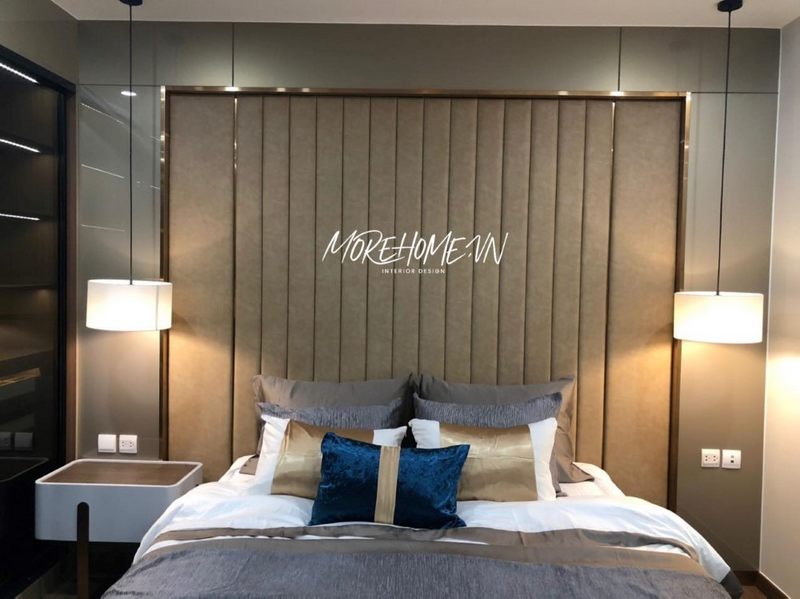 Để bức tường đầu giường đỡ nhàm chán, khách hàng có thể lựa chọn làm một bức vách ốp đầu giường bằng nỉ trần chỉ inox vàng sang trọng này