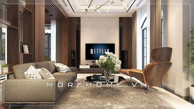 Mẫu thiết kế nội thất phòng khách sử dụng gỗ tự nhiên có màu trầm và kiểu dáng đơn giản giúp tạo nên phong cách đẳng cấp và trẻ trung hiện đại cho ngôi nhà của bạn.