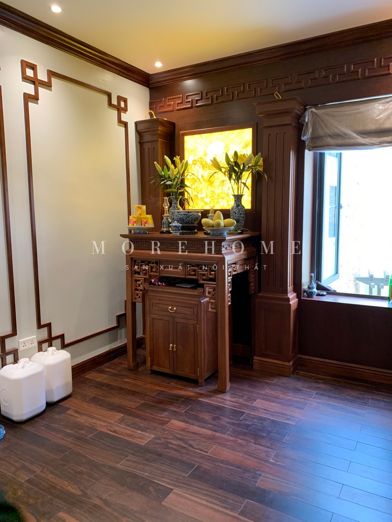 Mẫu bàn thờ gỗ tự nhiên được sản xuất tại Morehome các thợ lâu năm có kính nghiệm dựa vào 2 yếu tố truyền thống và phong thủy thể hiện sự biết ơn, thành kính sâu sắc tới thế hệ đi trước