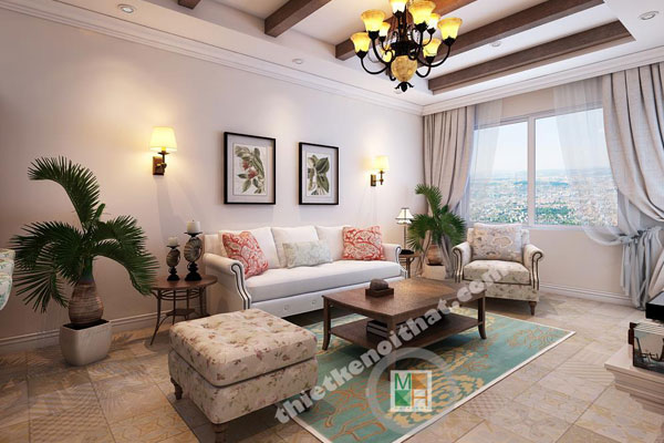 Không gian phòng khách của ngôi nhà này được các kiến trúc sư của nội thất Morehome thiết kế theo phong cách cổ điển với bộ sofa thiết kế vô cùng ấn tượng và bắt mắt. Một chiếc ghế sofa dài màu trắng thanh tao, kết hợp với ghế đơn hoa văn độc đáo cùng những bức tranh treo tường, đèn chùm, cây cảnh tạo nên tổng thế phòng khách hài hòa và lôi cuốn.