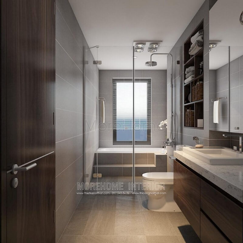 Tủ phòng tắm màu trầm kết hợp cùng mặt bàn đá lavabor cùng trang trí hiện đại giúp cho phòng tắm nhỏ trở nên đẹp, sang trọng và đầy tiện ghi.