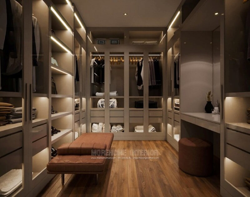 Phòng thay đồ với ý tưởng thiết kế khoa học nhiều ngăn sẽ giúp bạn lưu trữ đồ một cách thông minh.