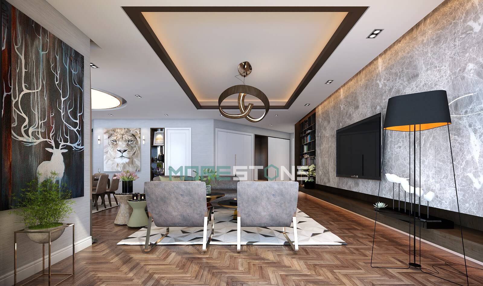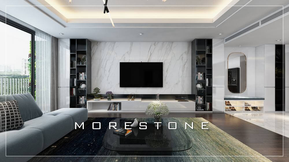 Thiết kế đá ốp vách tivi phòng cách trắng vân mây sang trọng